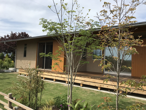 母屋の玄関入り口との関係に配慮し、コミュニケーションがとれる計画としている。
