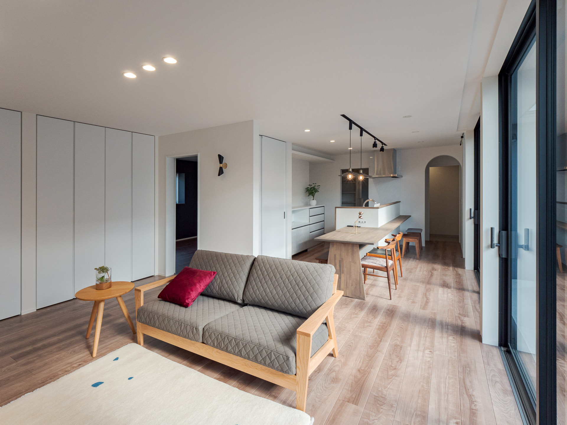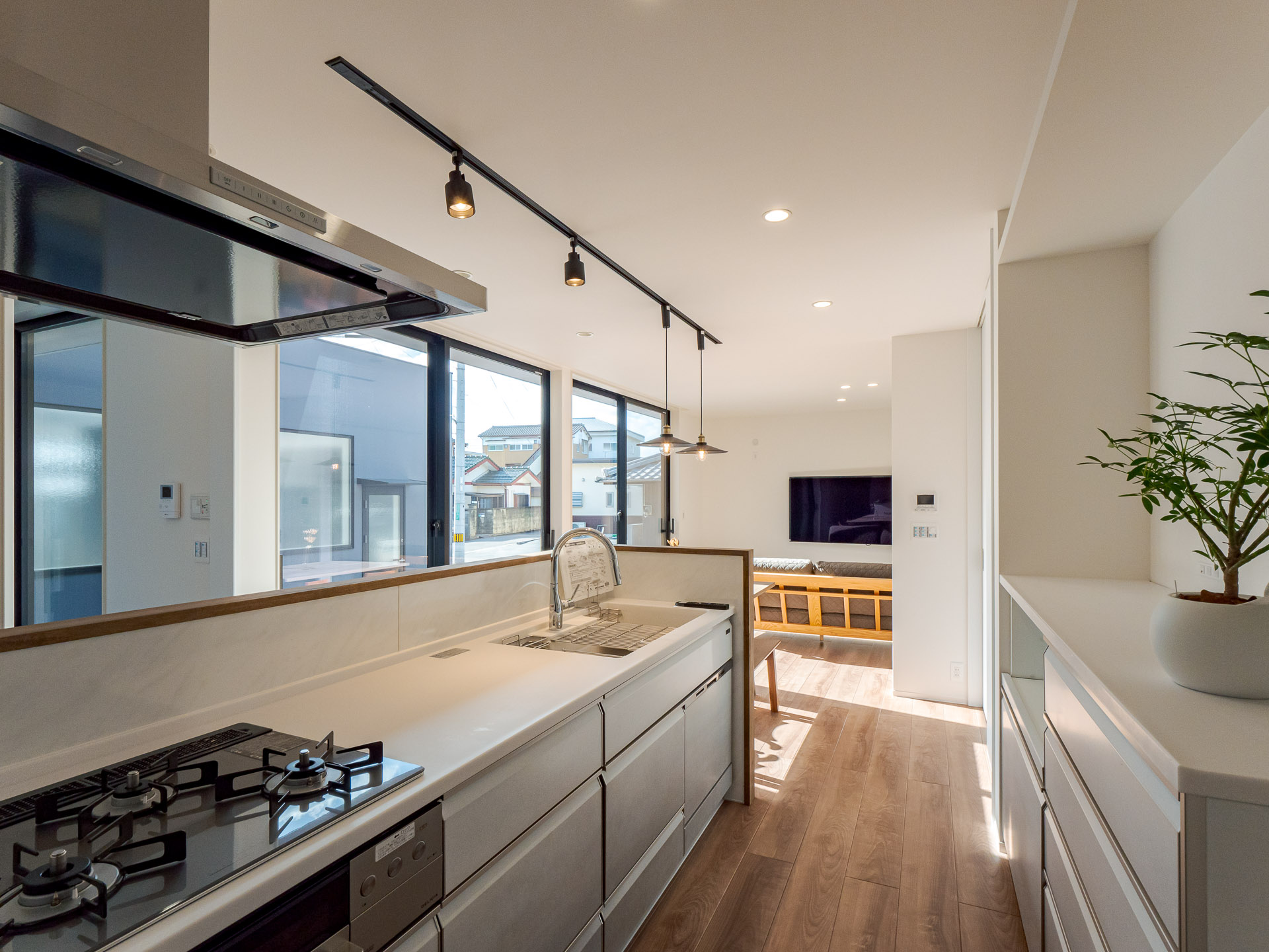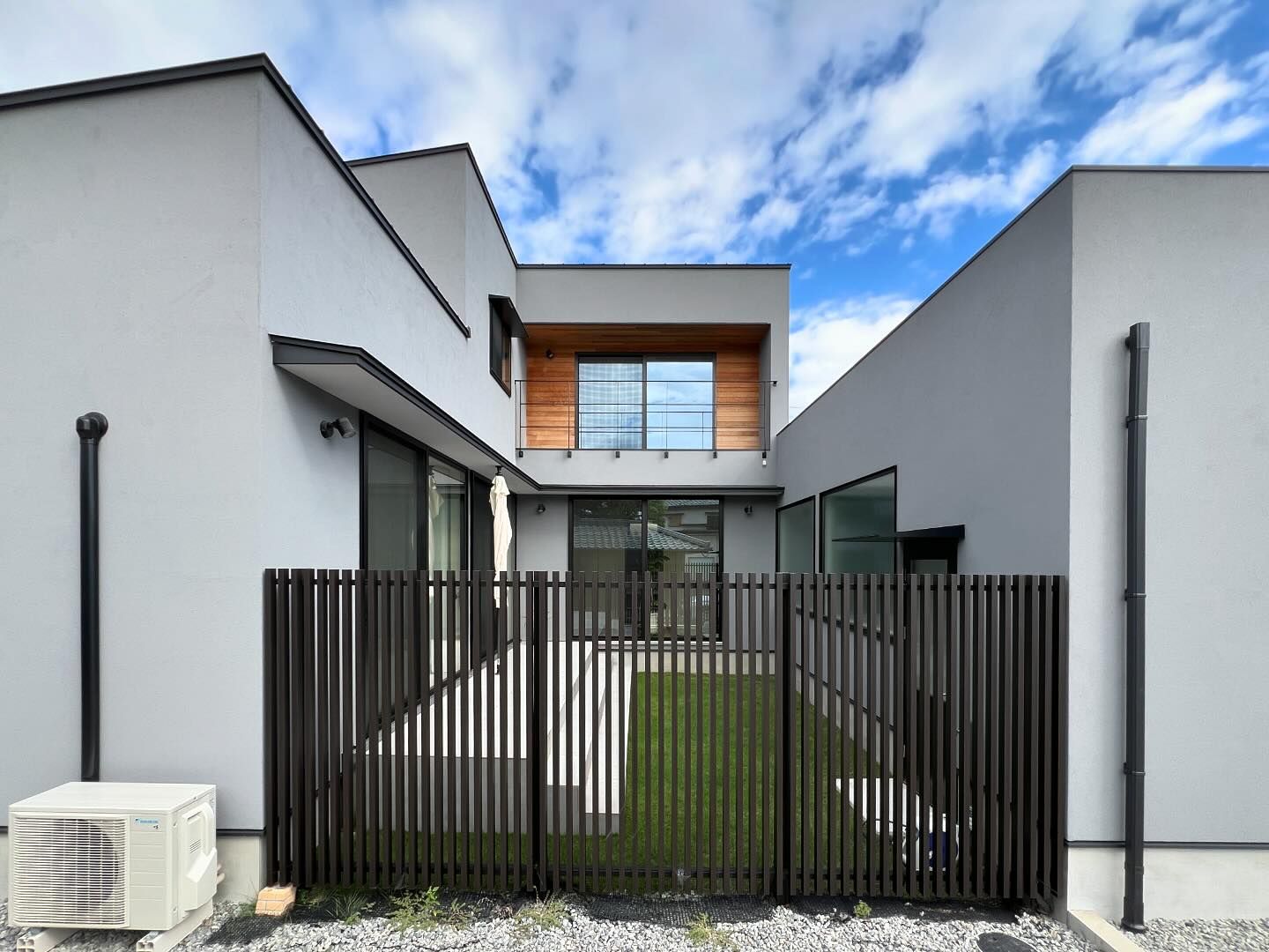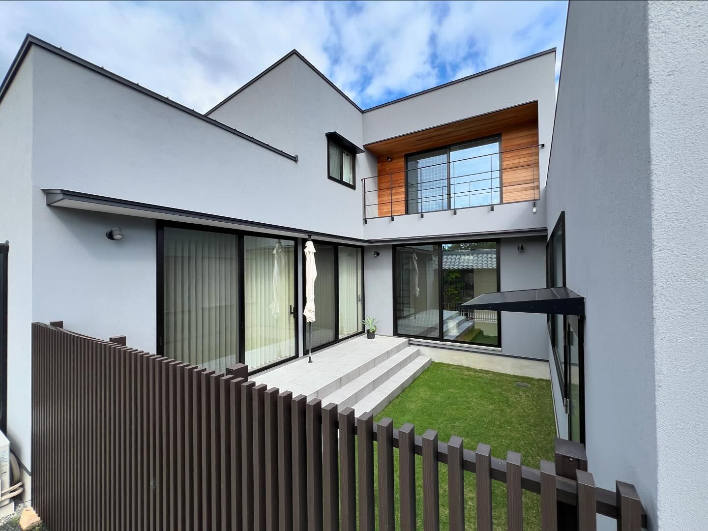 敷地周辺には2階建て建物等があり、隣接建物の影響を考え、環境の良い場所を探りながら、中庭、LDKの配置計画をしています。Data ――――――――――――――――――――――――――――――――――――――――――――――― 所在地:香川県善通寺市 構造規模:木造2階建て 延床面積:168.92㎡ 竣工:2022年 12月 施工:株式会社 田中建設