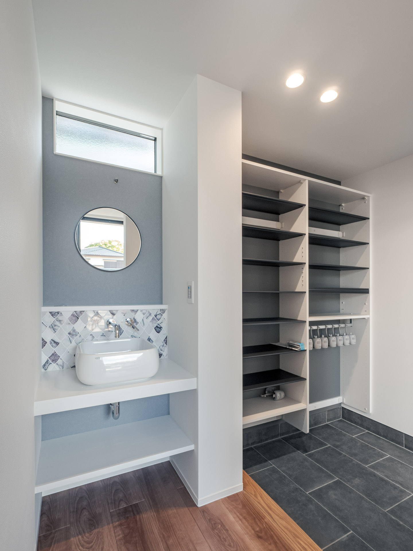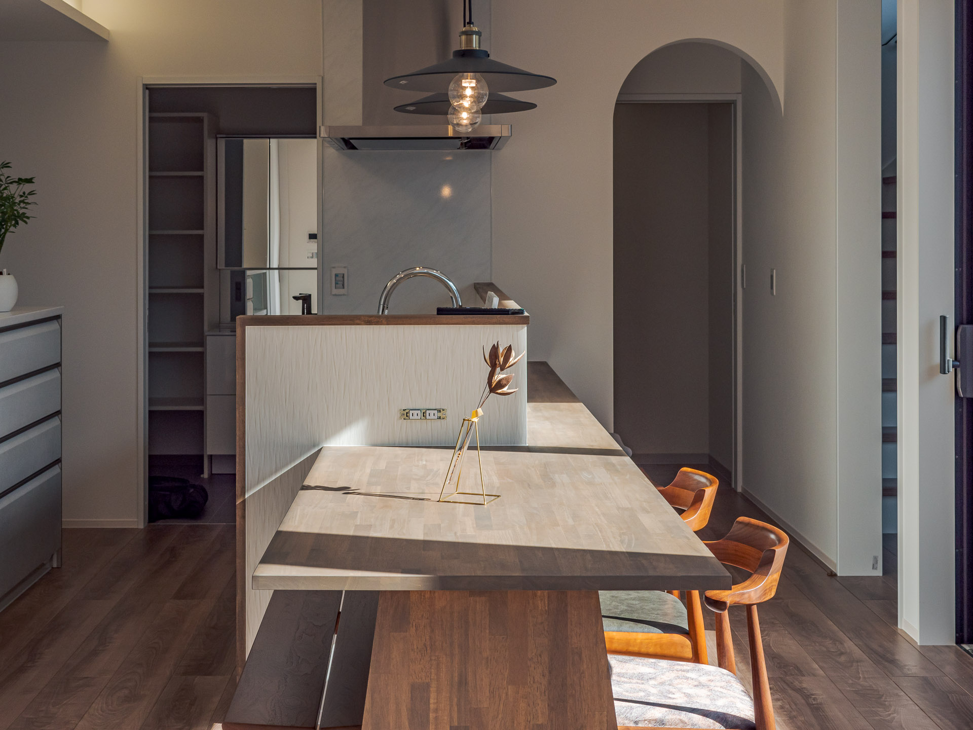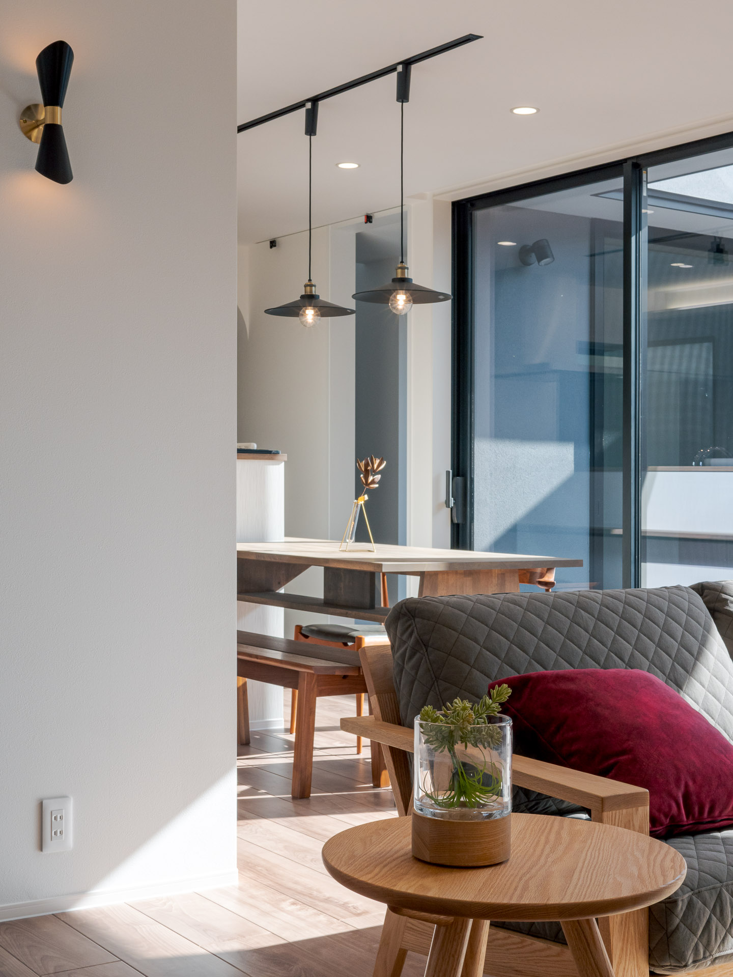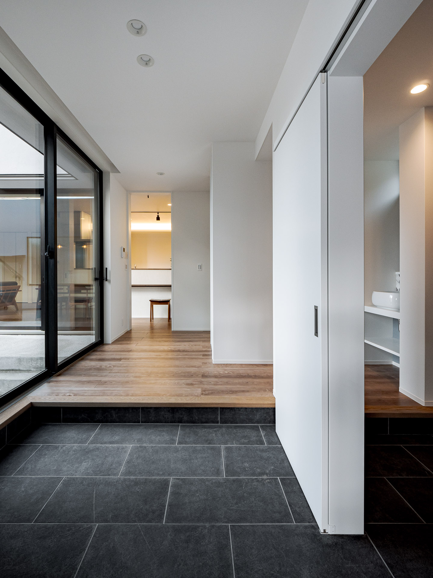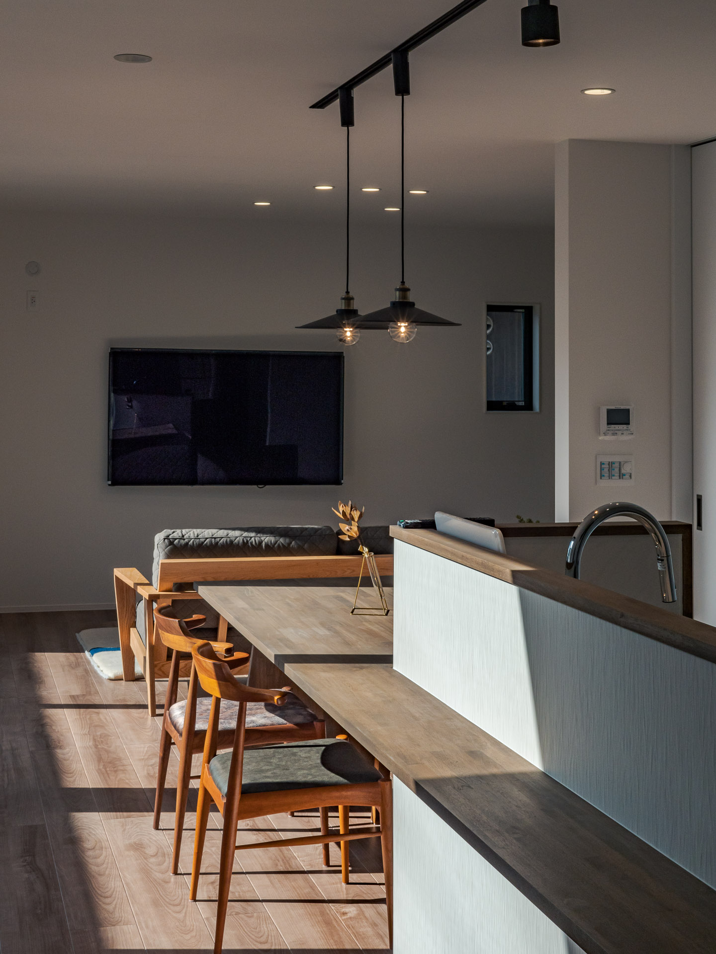 敷地周辺には2階建て建物等があり、隣接建物の影響を考え、環境の良い場所を探りながら、中庭、LDKの配置計画をしています。Data ――――――――――――――――――――――――――――――――――――――――――――――― 所在地:香川県善通寺市 構造規模:木造2階建て 延床面積:168.92㎡ 竣工:2022年 12月 施工:株式会社 田中建設