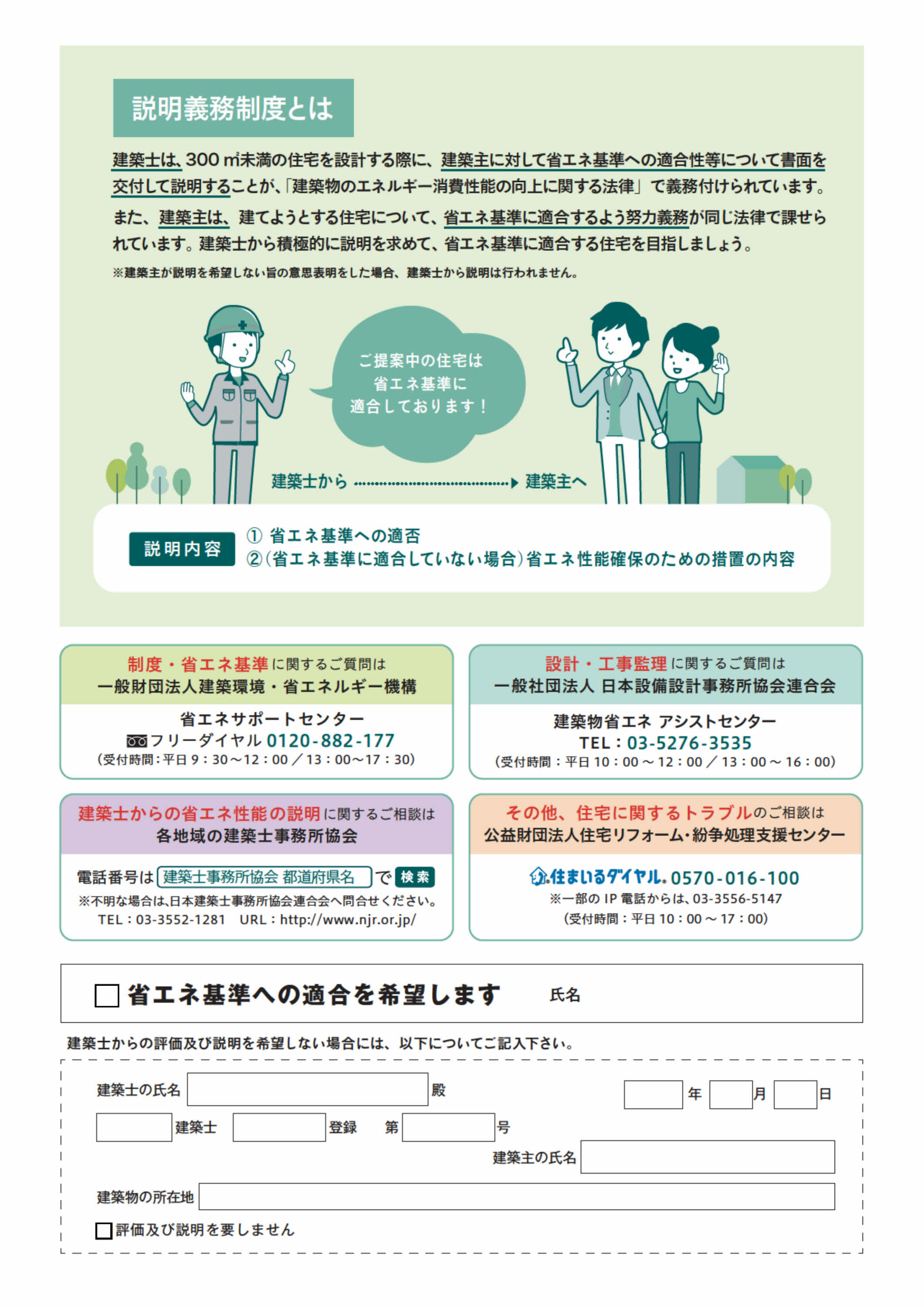 省エネ基準への適合性についての説明義務制度について 本日より省エネ基準への適合性について、説明義務制度が始まります。 建築物のエネルギー消費性能の向上に関する法律 (脱炭素社会)の観点から 建築物の省エネ性能向上は、大変重要な内容です。 省エネ性能を現す指標として、外皮平均熱貫流率(UA値)、冷房期の平均日射熱取得率(ηAC値)、BEIと 専門的な数値で、分かりづらい所があるかもしれません。効果がどの程度あるのか等 分かりやすい説明を心がけて行きます。