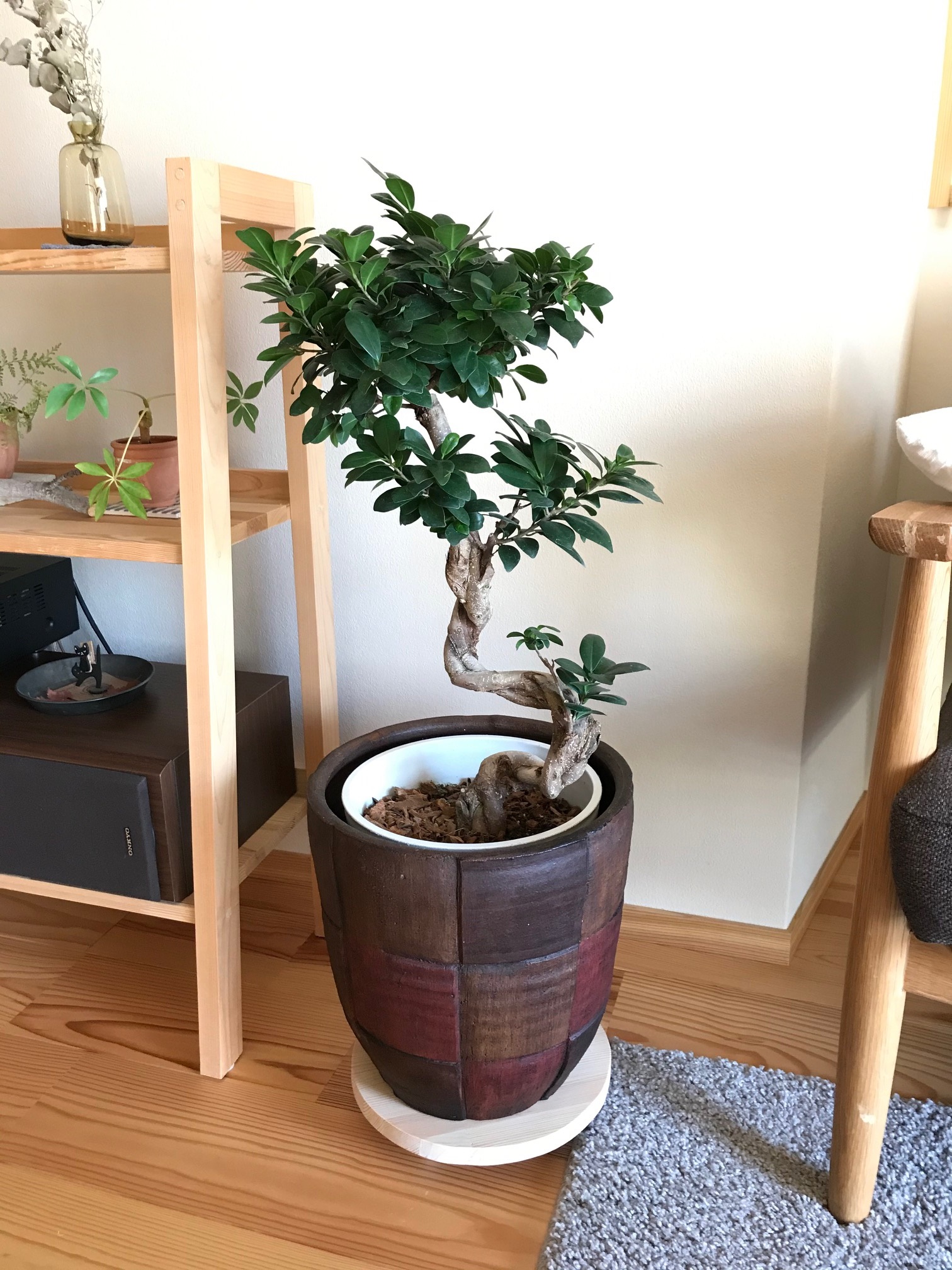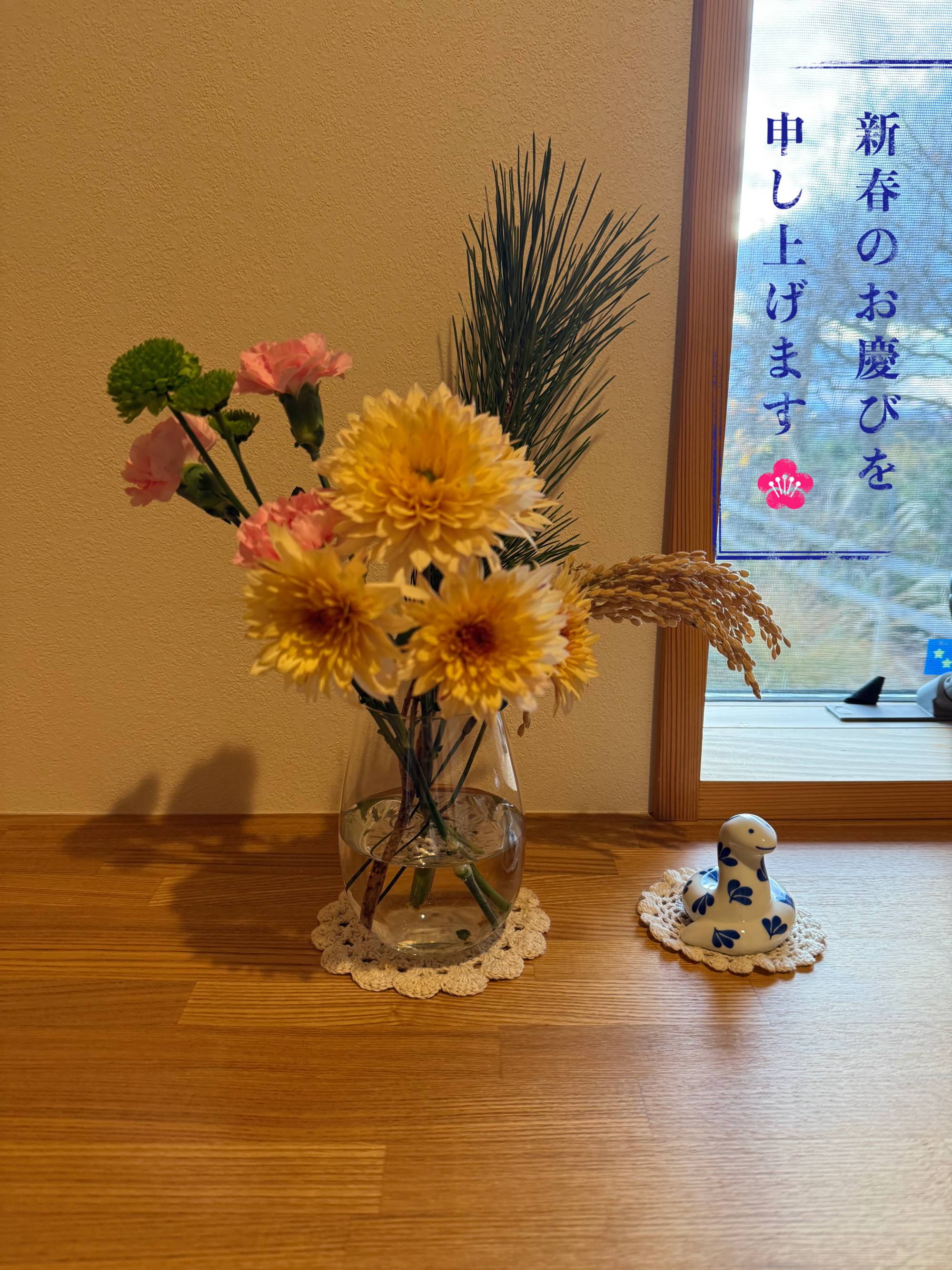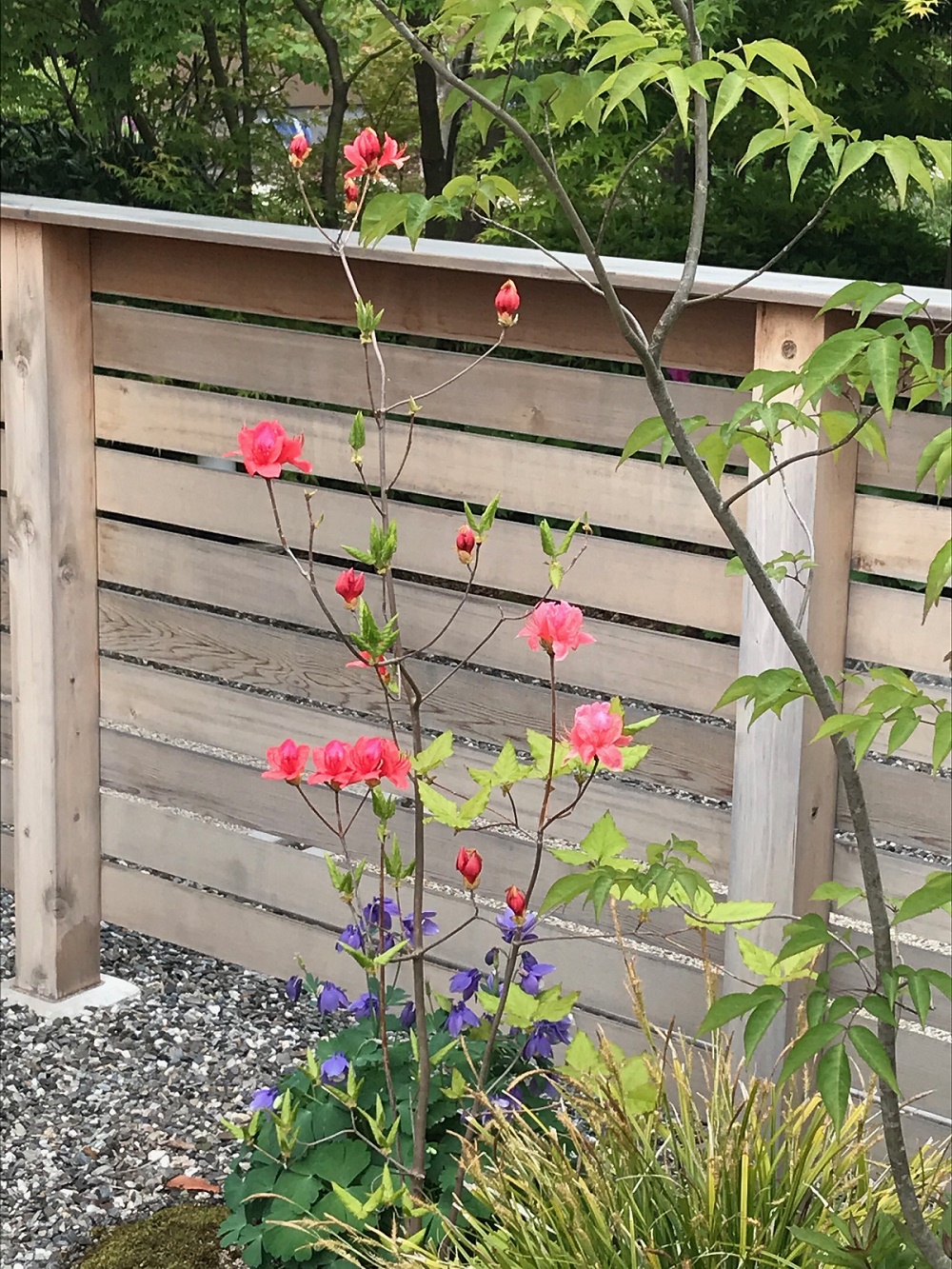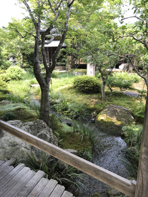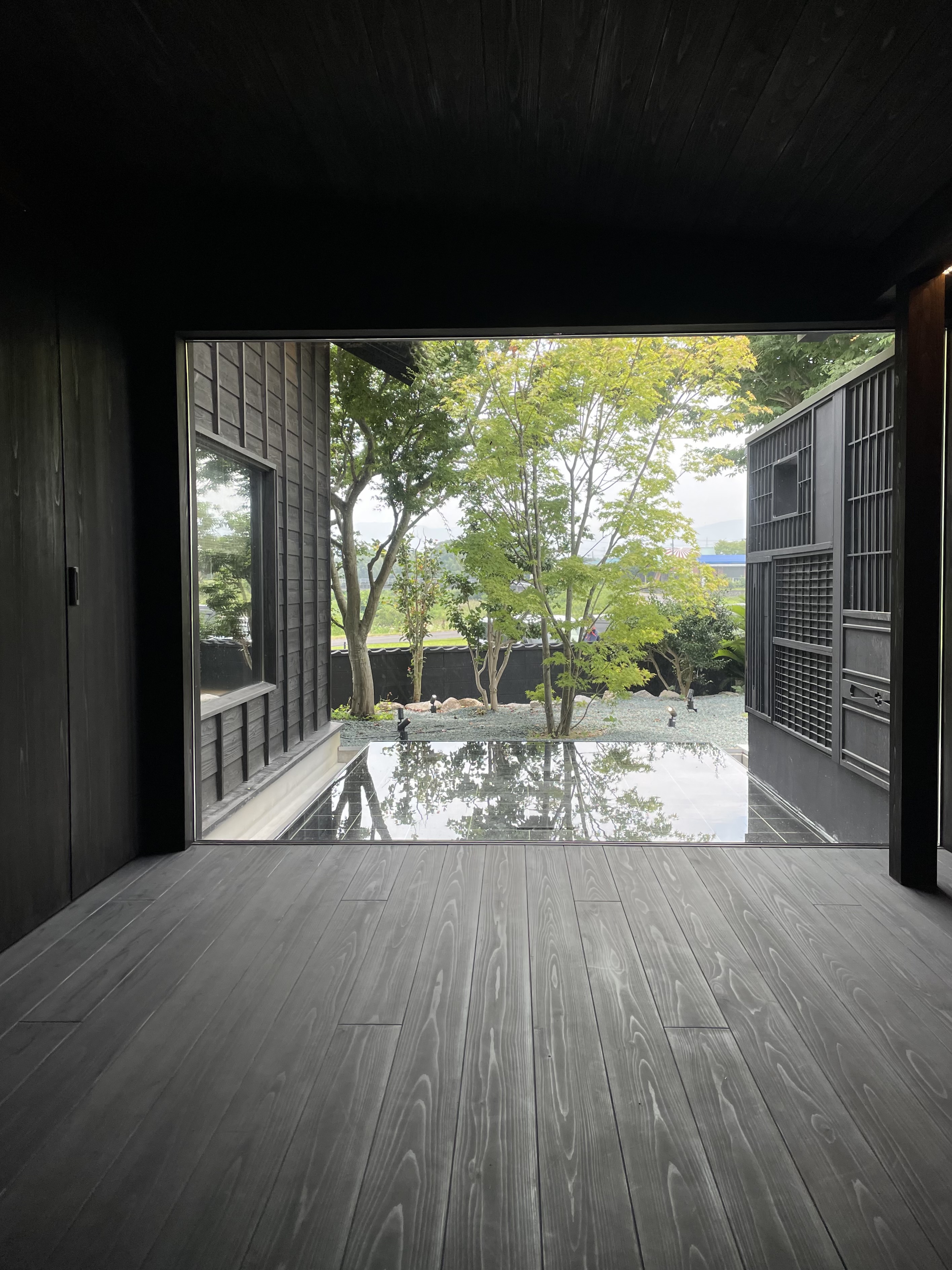 店舗エントランス 昼食を食べに行って、店舗の入口に嬉しくなりました。 店舗内部があえて明るさが抑えられていて、屋外の植栽、景色、水盤に目が惹かれました。 フローリングの張り方向、色、FIX窓高さに合わせて、袖壁(既存建具流用?)設置され、パースラインにより 奥行が感じられる。近景に植栽、遠景に川が見え、意図的に景色が切り取られていました。 丁寧に設計されており、設計者の方を知りたくなります。もちろんおいしく昼食を頂いたのですが 仕事柄、思わず写真を撮ってしまいました。